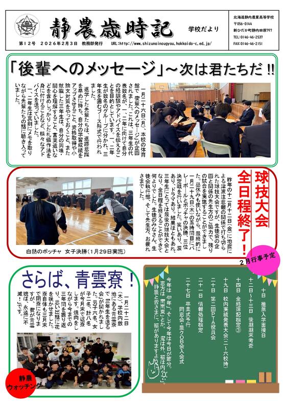 さて、今回の学校だよりは、3年生から後輩へのエール「先輩からのメッセージ」、昨年から持ち越しになっていた球技大会、そして、先月末に本校「青雲寮」を退寮した3年生を取り上げました。寒い冬もあと少し。皆さまも風邪などひかぬよう、暖かい春を思い描いて日々暮らしていただけたらと思います。