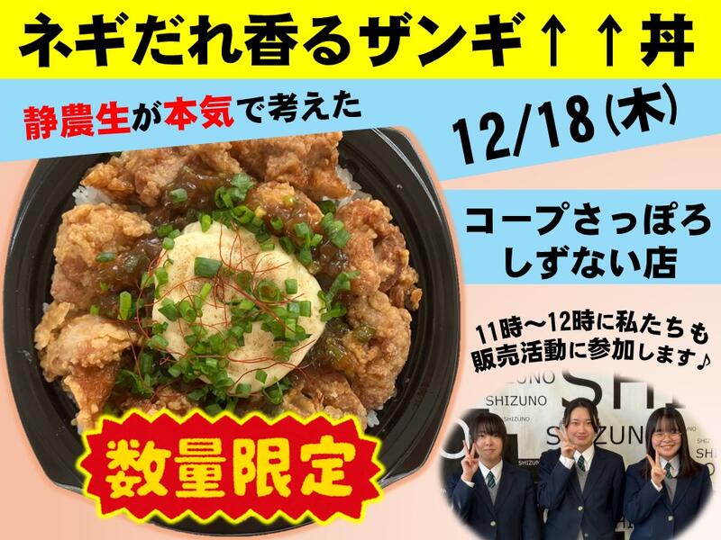 12月18日(木)にコープさっぽろしずない店様で食品科学科の生徒が考えたお弁当が販売されます!商品名は、「ネギだれ香るザンギ↑↑丼」で、特製ザンギと本校のネギダレが絶妙にマッチした食べ応え十分のお弁当になっています!販売は、12月18日(木)のみを予定しているので、ぜひコープさっぽろしずない店までお越し下さい!なお、販売当日の11:00~12:00の時間帯は、このお弁当を考えた食品科学科3年生の生徒たちも販売に参加いたします!!皆様のご来店をお待ちしています。