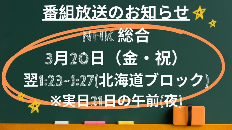 [NHK 総合] 3月20日(金・祝) 翌1:23~1:27 ※実日21日の午前(夜)〈北海道ブロック〉