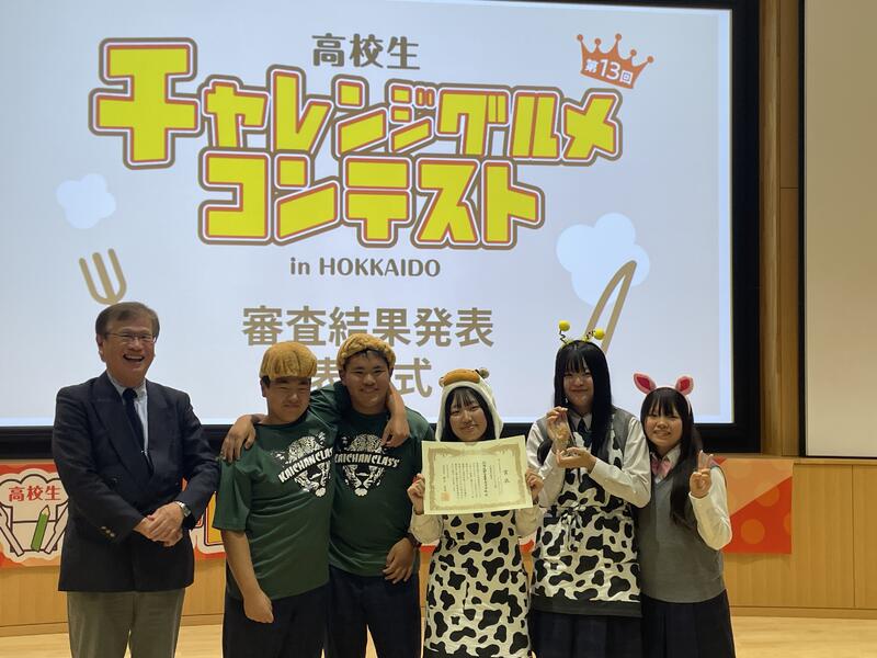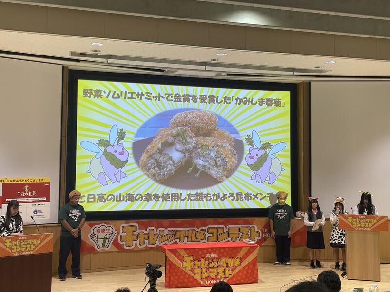 10月4日(土)、札幌市の北海道大学内にて行われた「高校生チャレンジグルメコンテスト」本選に本校の食品科学科の生徒が出場しました。コンテストでは、開発した商品の試食審査や商品についてのプレゼンテーションを行いました。新ひだか町産の「豚肉(健酵豚)」、「かみしま春菊」、「日高昆布」、「はちみつ(太田養蜂場)」、「おから(河田食品)」、日高産の「チーズ」を使用した「ご当地メンチカツ」は高く評価され、「チャレンジグルメ大賞(北海道知事賞)」を受賞することができました。この結果は、今まで開発にご協力いただいた地域の皆様のおかげです。この場をお借りしてお礼申し上げます。また受賞した生徒の皆さんは今までの努力が実り良かったですね!最後にコンテストを運営されたコープさっぽろ様をはじめとした皆様、この度は貴重な機会をいただき、大変ありがとうございました。今後も地元の食の魅力を発信できるようチーム静農で頑張って参ります。【コンテスト当日動画のURLは下記となります※本校の発表は、配信開始後から約2時間30分後です。】
