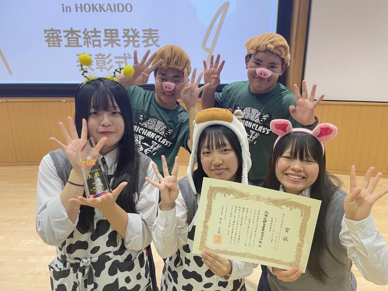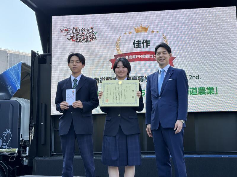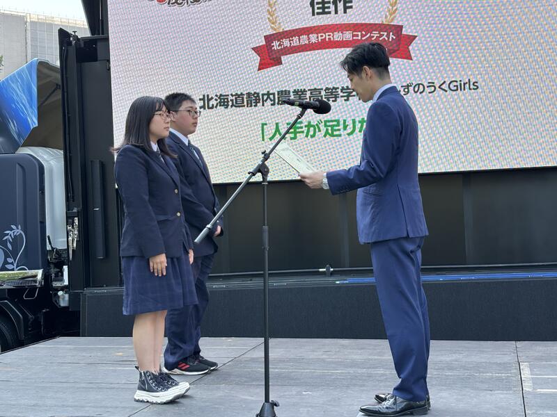 10月4日(土)の「ほっかいどう秋の大収穫祭」にて行われた北海道農業PR動画コンテストの表彰式に参加しました。農業クラブで作成した2作品がエントリー、共に佳作に入賞し鈴木直道知事から表彰をいただきました。座談会ステージでは2名が登壇、農業高校での日常や学習、そして将来の夢などについて話をしました。